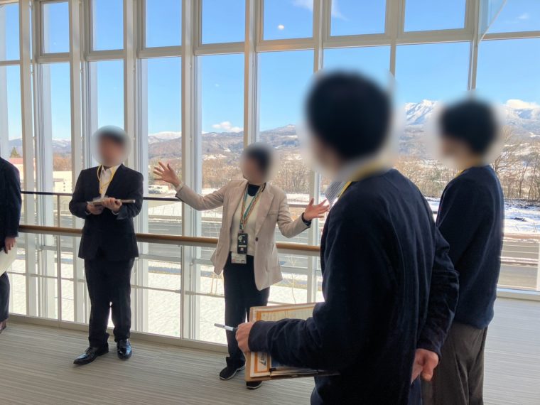 移動中は、事務局よりバスツアーで見るべきポイントを教わりました。初めての就活イベント参加でも安心です。